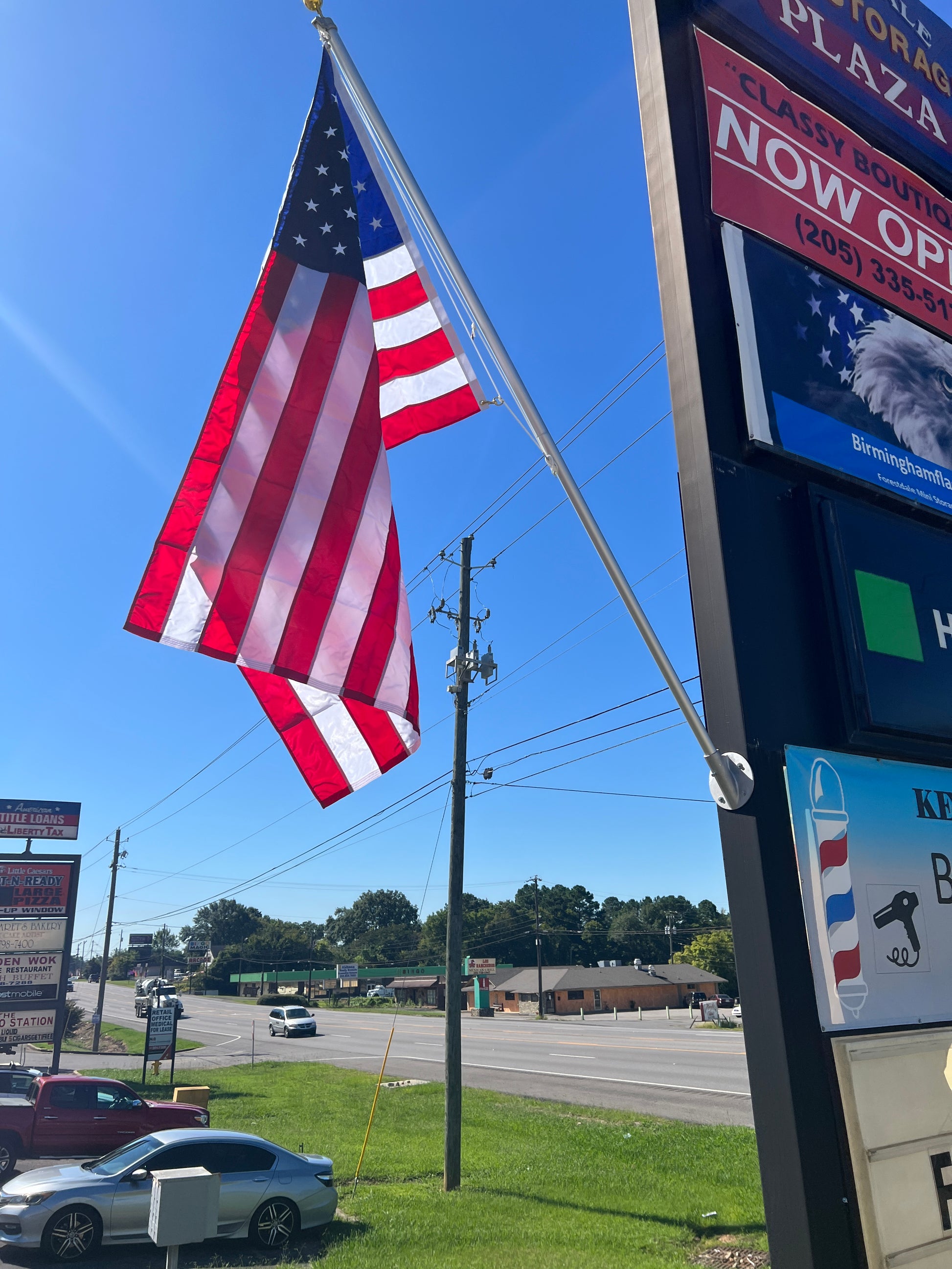 Heavy Duty, wall mount flagpole by Concord American Flagpole. We have this flying at our store and we have a 5’x8’ flag flying!