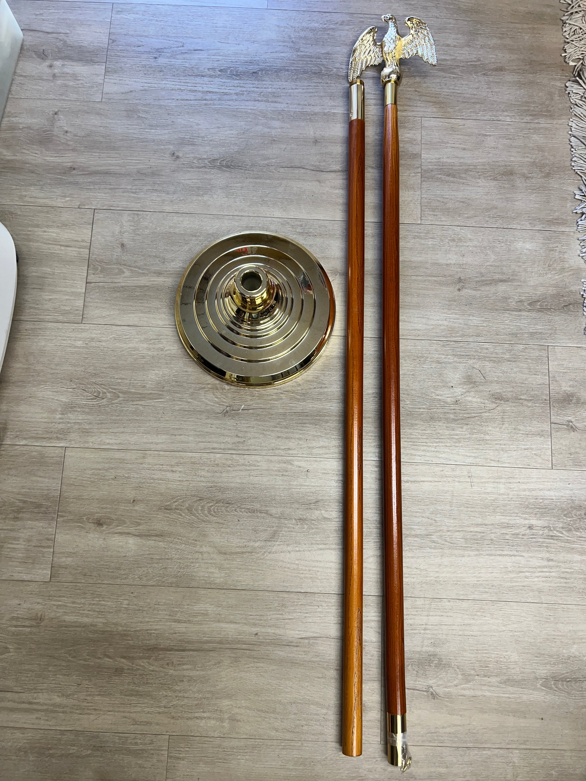 Six Complete sets for indoor display. 8' Oak Pole, 1 1/4" Diameter, Brass Ferrule with Gold Metal Eagle topper and Gold Base.