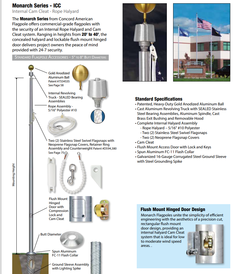 Monarch Series, Internal Cam Cleat Rope Halyard Commercial Grade Flagpoles with the security of an internal rope halyard. Price is for satin finish, many other options available Call for best price and shipping.