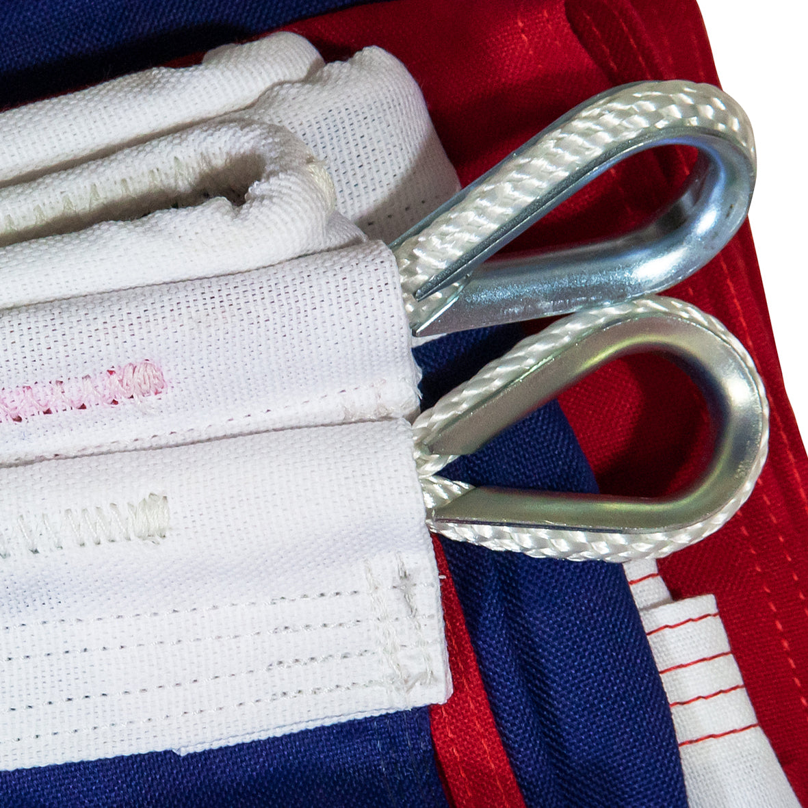 100 % spun polyester. Durability, strength and fly ability. Ideal for extreme weather conditions without excess weight. Poly, made in the USA, Header and grommets, Embroidered Stars, Sewn Stripes, high wind. Made in the USA, flag features Sewn Strips and Embroidered stars on sizes up to 10x15, 15'x25' have appliqued stars and sewn stripes. treated to resist Fading and flies in the slightest breeze.